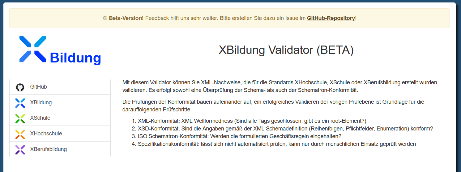 Die folgende Anleitung beschreibt das Validieren mir Programmen, die auf dem eigenen PC installiert werden müssen. Seit Anfang 2025 verfügt XBildung über einen Online-Validator, mit dem auf einfache Art die Korrektheit von XML-Nachweisen überprüft werden kann. Die Verwendung dieses Validators ist die empfohlene Art, XBildungs-Nachweise zu überprüfen.